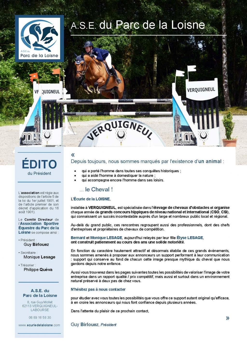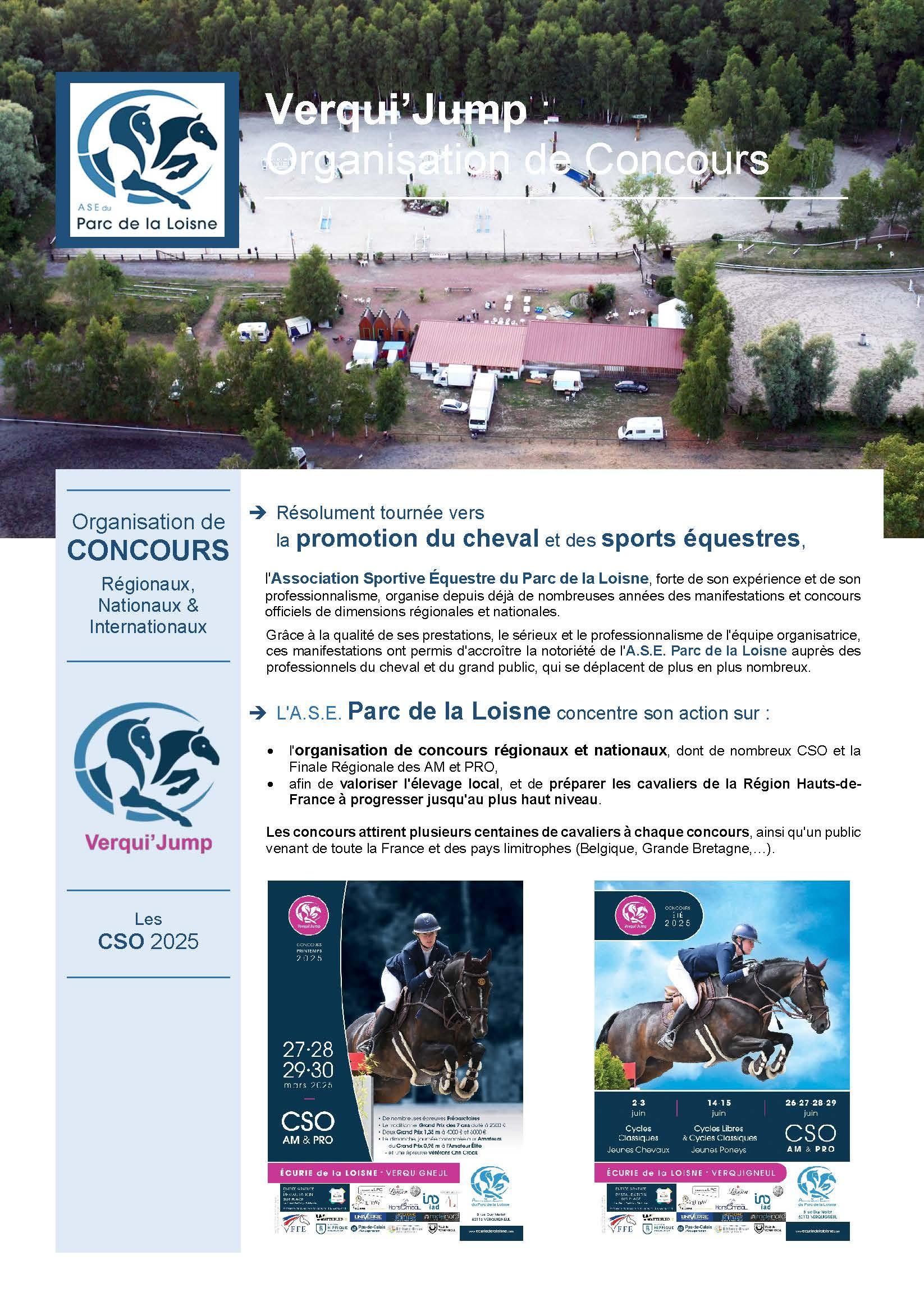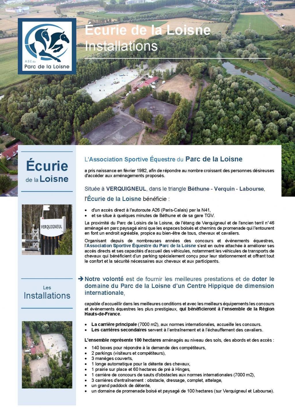 Résolument tournée vers la promotion du cheval et des sports équestres, l’Association Sportive Équestre du Parc de la Loisne, forte de son expérience et de son professionnalisme, organise depuis de nombreuses années des manifestations et concours officiels de dimensions nationales et internationales, auxquelles participent de nombreuses nations étrangères et des cavaliers de renommée mondiale.